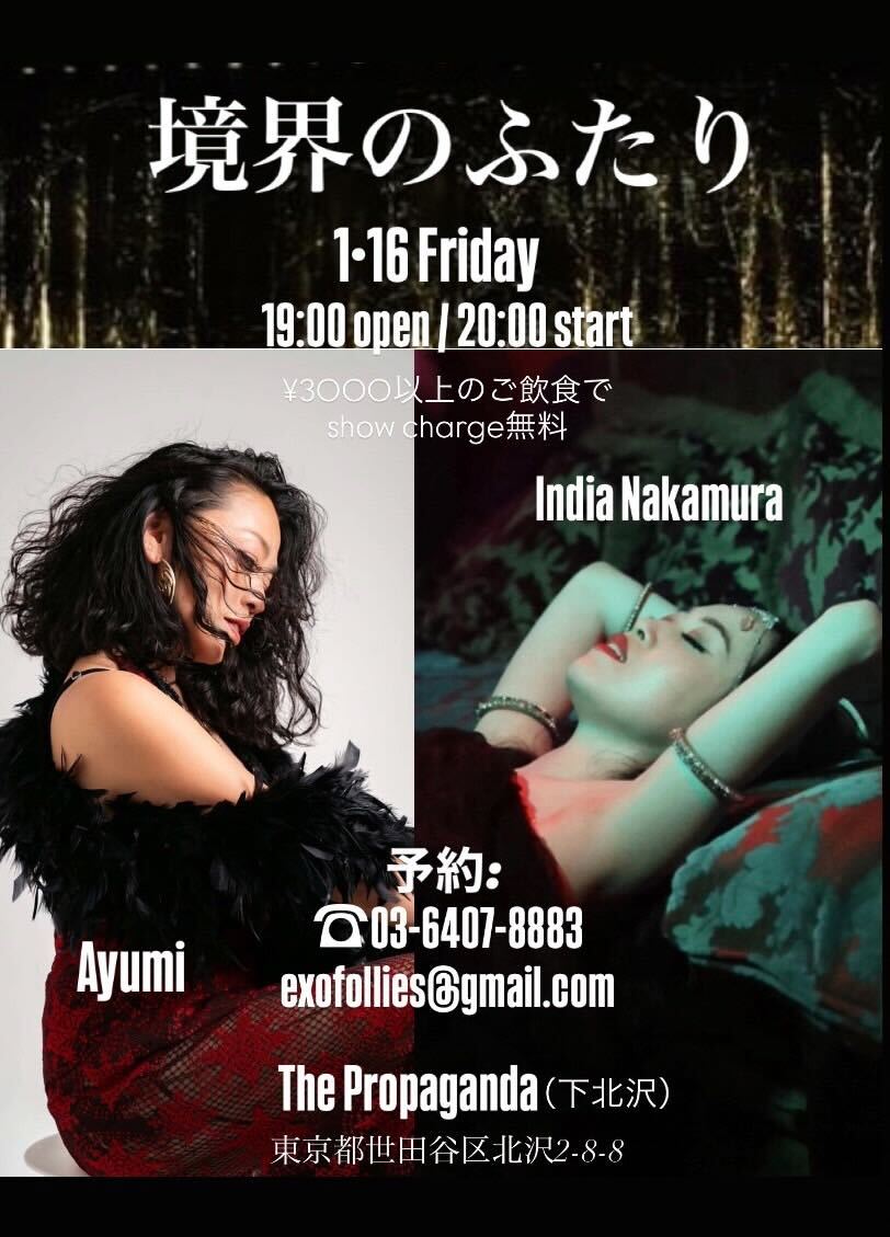 日常に潜む様々な「境界線」をテーマに熱情の洒脱なジプシーの女王AYUMIとシアトリカルな表現で活躍の場を広げ続ける中村インディアによるコラボレーションでお届けするスペシャルショー。